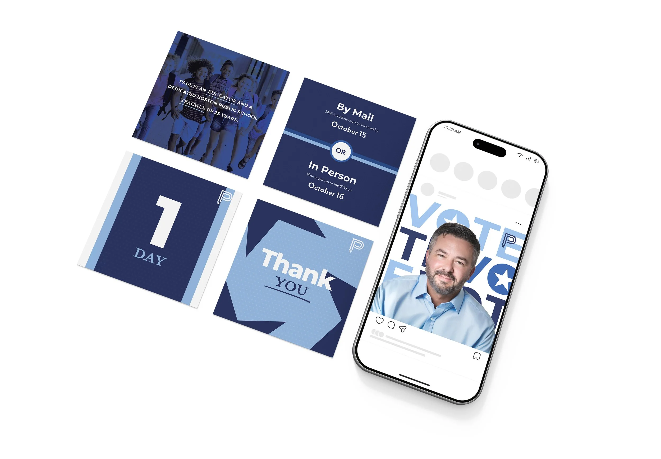 The final identity system centered on a refined monogram-style “P” mark paired with a structured blue palette that conveyed professionalism, calm authority, and institutional trust. Subtle civic references, including star motifs and clean geometric framing, allowed the brand to feel appropriate for a leadership campaign without leaning into overt political cliché. Typography was selected for clarity and legibility across both digital and print environments, supporting everything from social media graphics to campaign signage and internal communications. The visual system prioritized consistency and flexibility, ensuring the campaign could maintain a strong presence across multiple touch points while keeping Paul’s message front and center. The result was an identity that felt modern, credible, and grounded, confident without being performative!