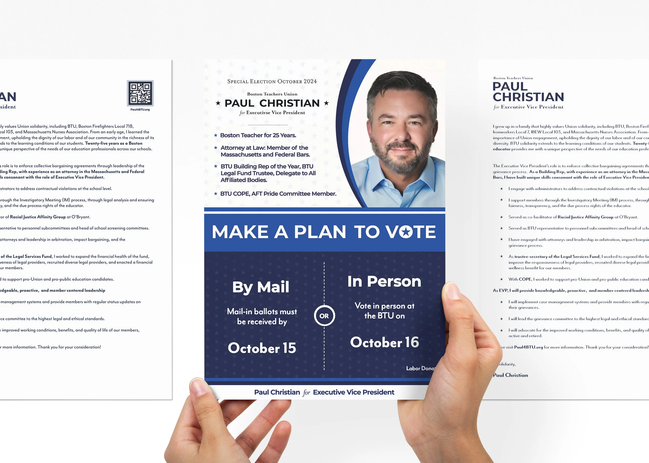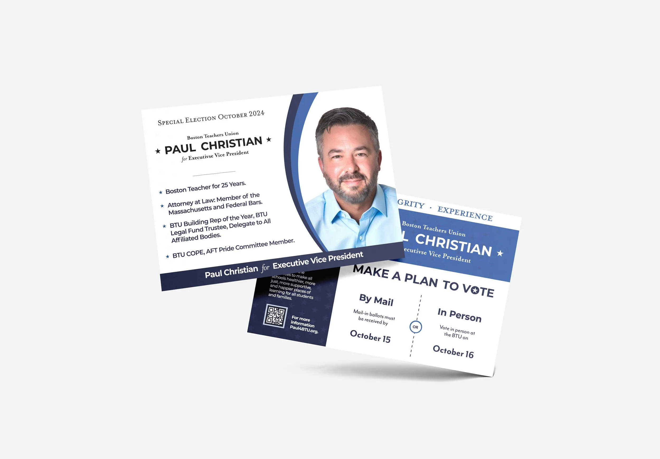 Running for Executive Vice President of the Boston Teachers Union required more than name recognition, it required trust, clarity, and a sense of steady leadership. Although Paul entered the race with over 25 years of experience as an educator and a professional background in law, translating that credibility into a cohesive campaign identity presented a unique challenge. Union elections often rely on predictable political aesthetics, heavy patriotic motifs, assertive messaging, and traditional campaign typography. While familiar, these conventions can blur together visually and dilute personal connection. The objective was to create a campaign identity that communicated professionalism, honesty, and proactive leadership while reflecting Paul’s deeply rooted reputation as a teacher, advocate, and community figure.